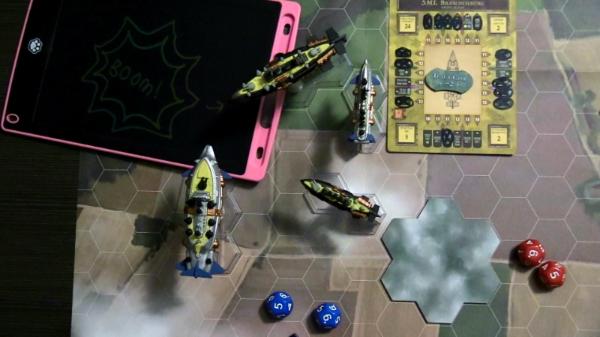 Turns 1-5First off, I should have had them start on a slightly reduced board size as there was no feasible way for the starter French or German ships to engage on turn one, but the range had closed enough for attacks to start being made on the second turn, so both kids stayed engaged. The speeds are very variable with French ships having about a 50% advantage over German ones until damage takes effect, but there was no risk of anyone being stuck and unable to maneuver.