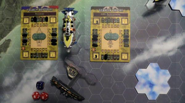 The first Break the Keel roll occurred on turn five; if damage is repeatedly done to the same location of a ship, it triggers a test on whether the ship is destroyed, which would be about when I expected from the readthrough. The French Bretagne survived, but with a permanent negative to be applied to future tests.
